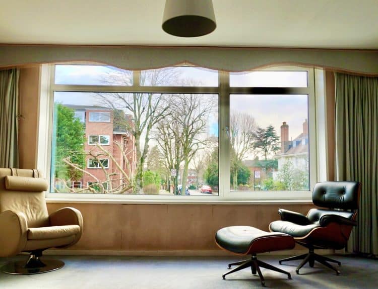 Mid–century modern/LA vibe to this end of terrace 3 storey location house close to Victoria Park and The Regents canal. The interior is open plan with floating walnut veneered units in the living area and main bedroom, white gloss units with inbuilt record decks in the lower ground floor living/kitchen area. The walls are covered in stretched cream/beige fabric panels and black glass.